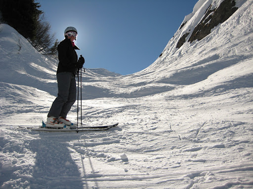 This is Rochassons, a red run that leads down to Plaine Dranse. It's a pity that it's a tough-ish run because it limits people getting over to Plaine Dranse from Avoriaz - they don't know what they're missing. Anyway, Natalie skillfully skids to a stop near the bottom.