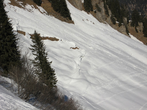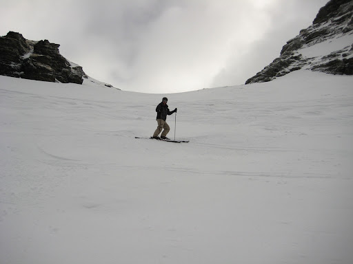 And this is for those who don't believe in avalanches. Quite disturbing really because we had to ski into this valley. Notice how this slab avalanche has pulled itself away from the mountain and creased? This shot doesn't give a good feel for the scale, but that crack is a good 30m across.