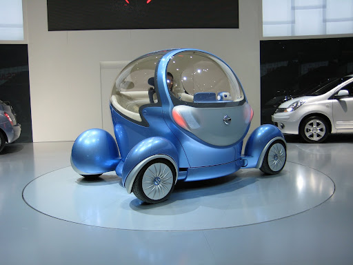 The Nissan Pivo2 proving that you can easily parallel park this tiny car into a space any normal person could get any normal car into without funny spinny-round wheels. Actually, this car is really cool - it even leans into corners for you.