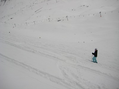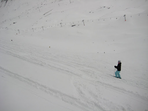 Today we figured we'd try our best to find some good powder. We headed up to Fornet and stayed very high on the Marmottes Snowcross. This is Natalie, very high, on the Snowcross.