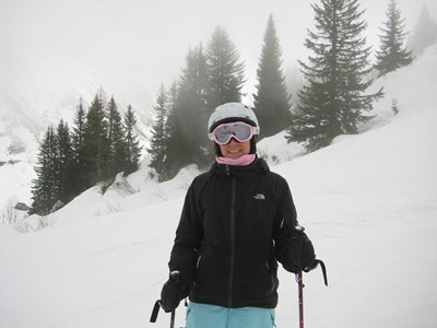 This is Natalie just above the Avoriaz chair-lifts in the gentle mist and rain.
